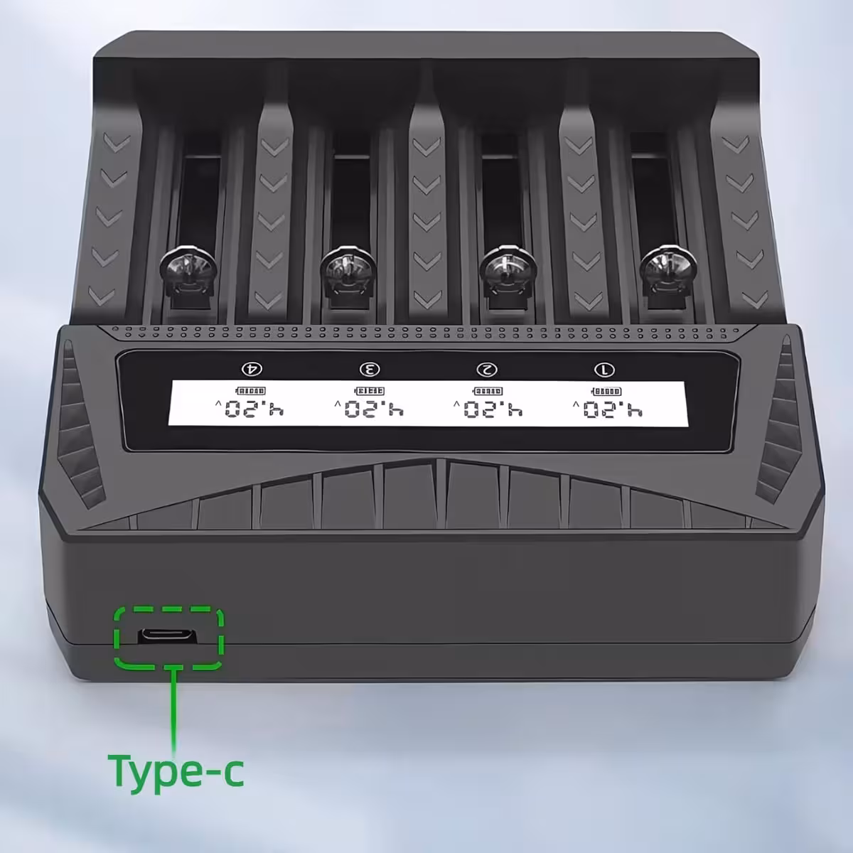 Questo caricatore per batterie ricaricabili è compatibile con accumulatori Li-ion 3.6/3.7V, Ni-MH e Ni-CD, inclusi i formati AA, AAA, 18650, 26650, 21700, 16340, 14500 e molti altri. Gli slot funzionano in modo indipendente,