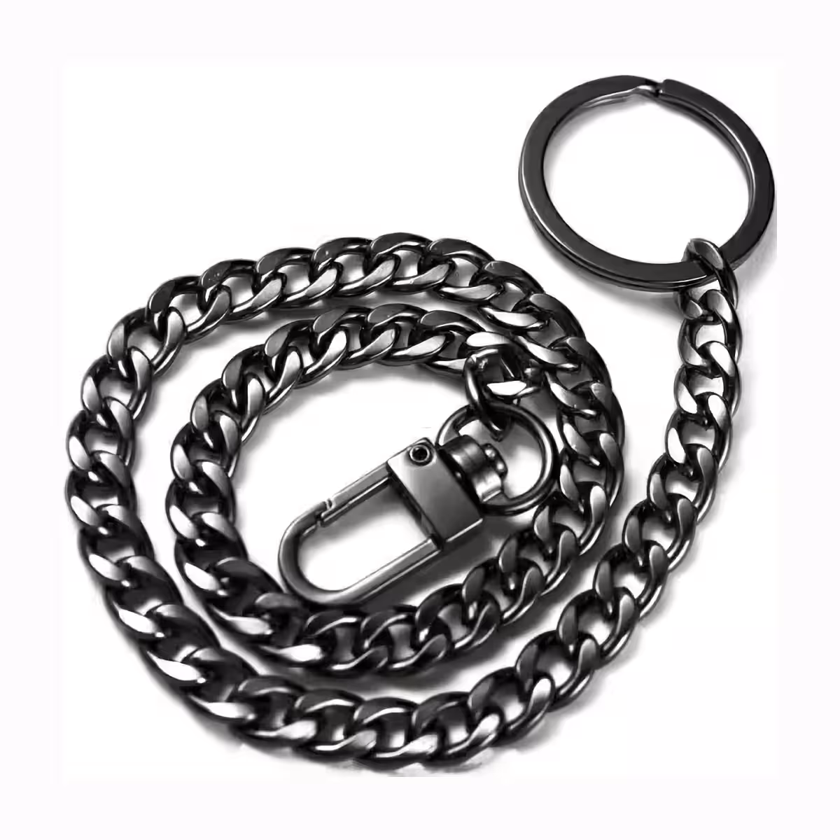 Realizzata in acciaio inox resistente, la catena ha una finitura nero cromato, una costruzione solida ed è dotata di chiusura Snap-On a un capo e portachiavi all’altro. Si può agganciare facilmente a jeans, pantaloni military, dritti o a vita bassa.