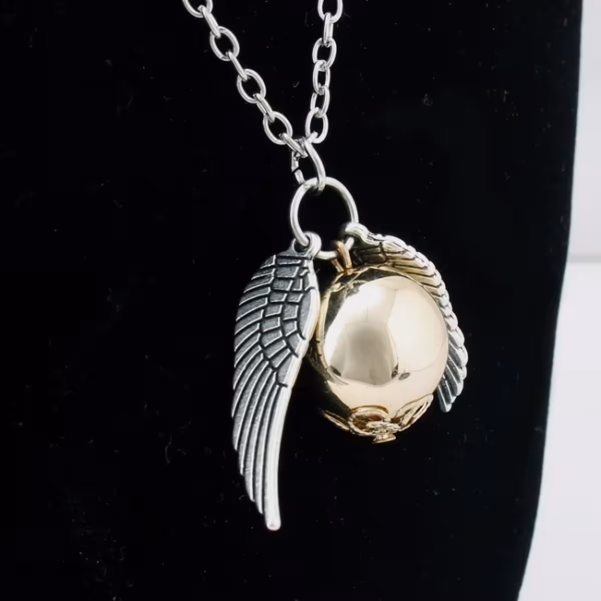 Questo pendente a tema Harry Potter rappresenta la palla di Quidditch “Golden Snitch”, con un design elegante che include un’ala d’angelo, simbolo di libertà e magia.