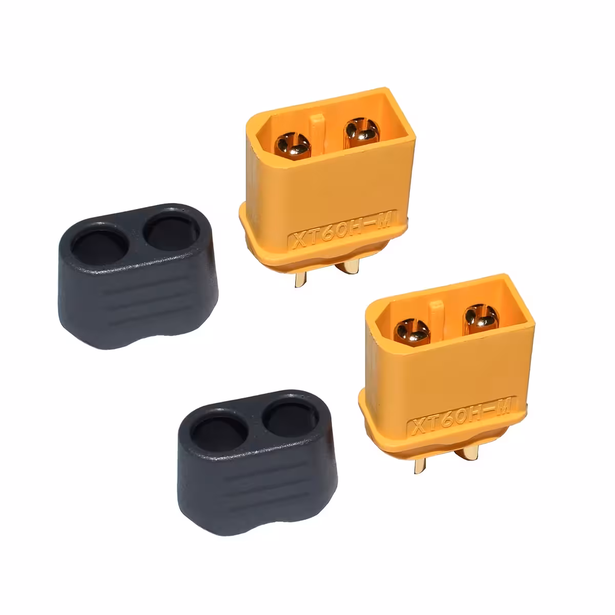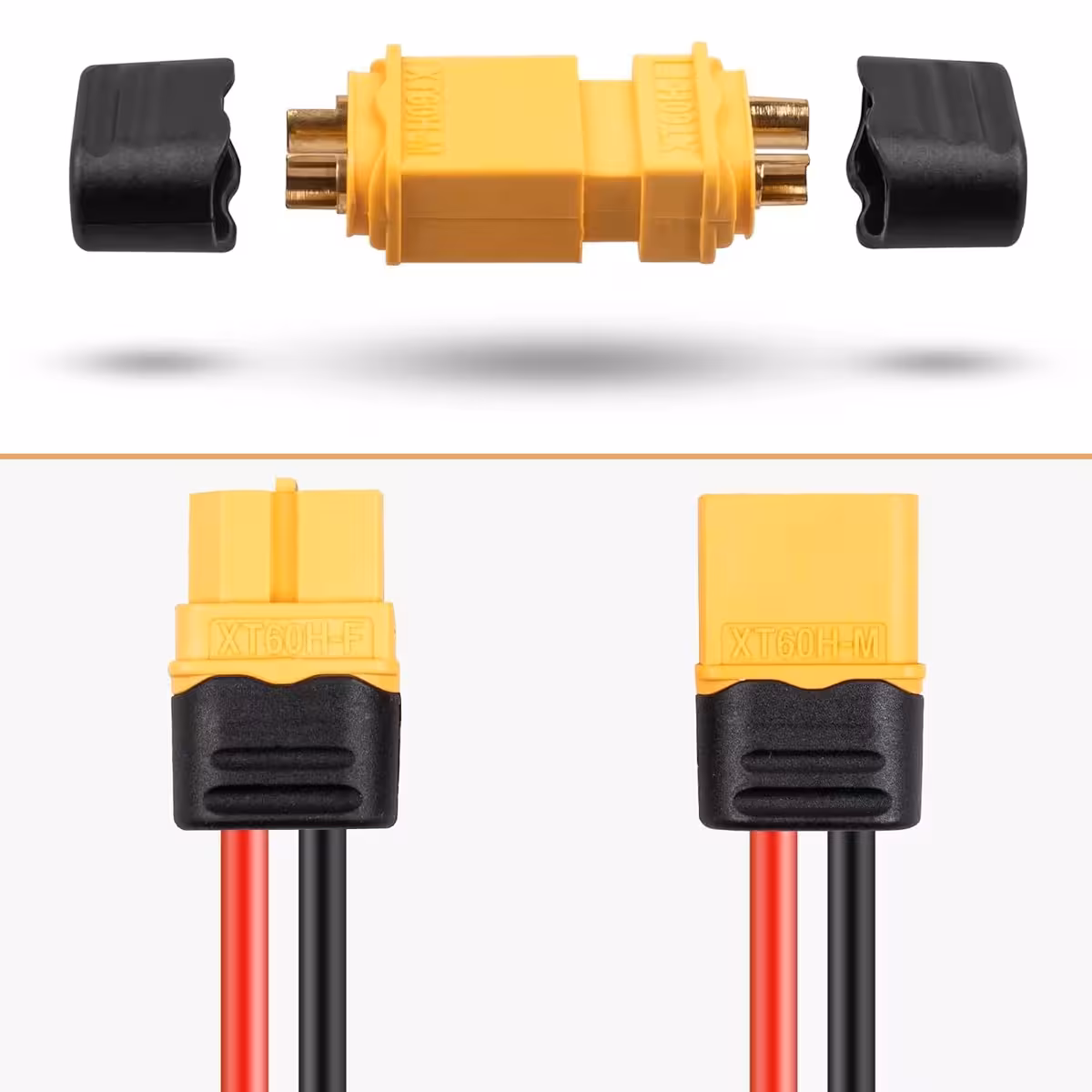 Set di 5 coppie XT60H maschio + femmina, rame placcato oro e corpo in nylon resistente alle alte temperature. Ideale per applicazioni RC, BMS, monopattini e biciclette elettriche. XT60H è la versione migliorata dello standard XT60, offrendo contatti placcati oro, maggiore resistenza alla corrente e compatibilità con i connettori XT60 standard.