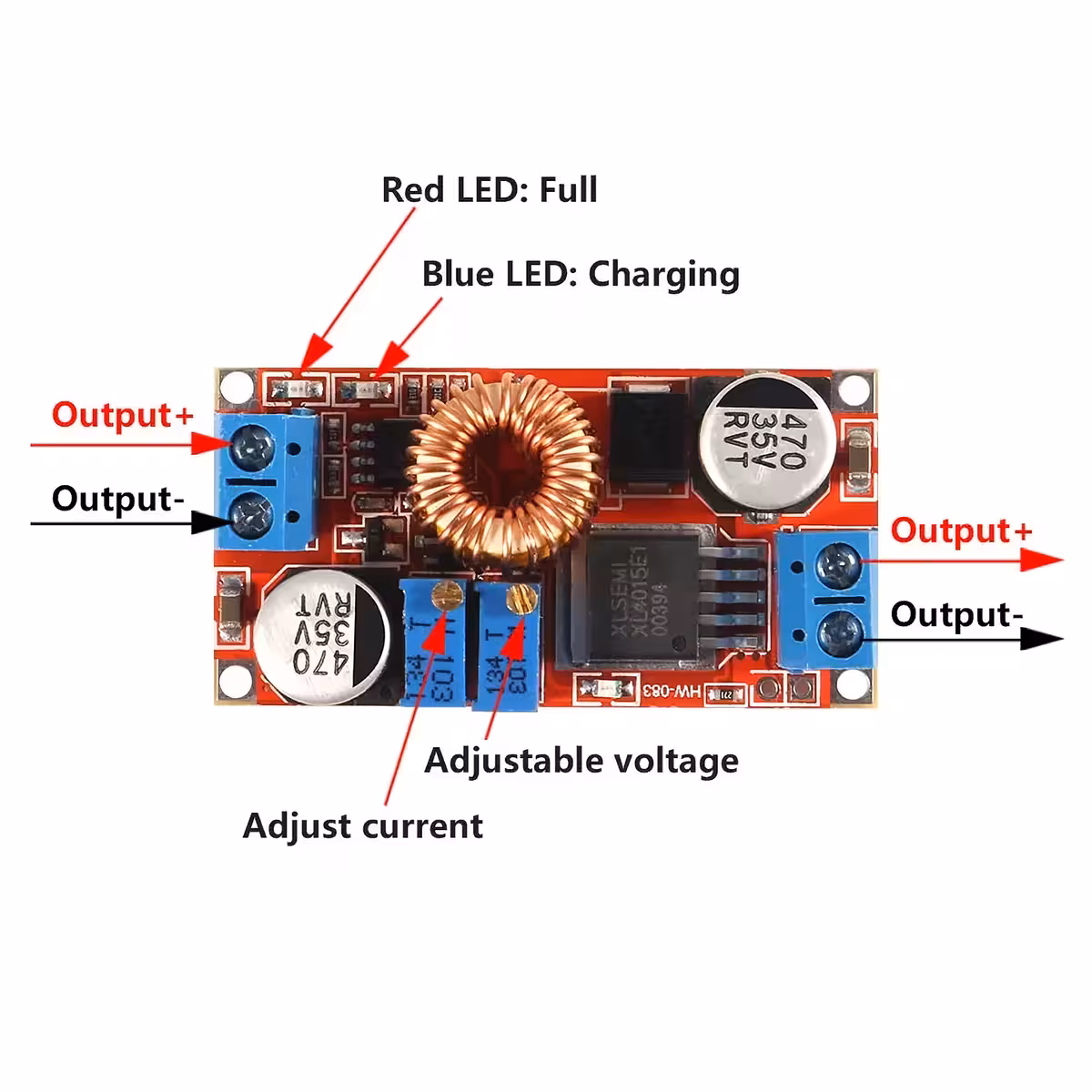 Il modulo XL4015 è un convertitore DC-DC step-down ad alta efficienza, con uscita regolabile tra 1,25V e 36V e corrente fino a 5A (consigliato max. 4,5A per maggiore durabilità). Supporta la regolazione della tensione (CV) e della corrente (CC), ideale per la ricarica di batterie o l’alimentazione di LED.