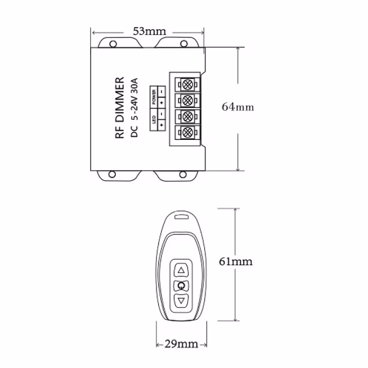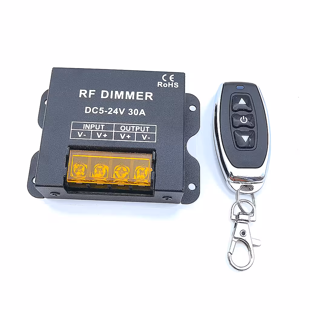 Questo dimmer per strisce LED, compatibile con tensioni di 5V, 12V e 24V, è un controller DC 5-24V, 30A, dotato di telecomando RF wireless a 3 pulsanti.