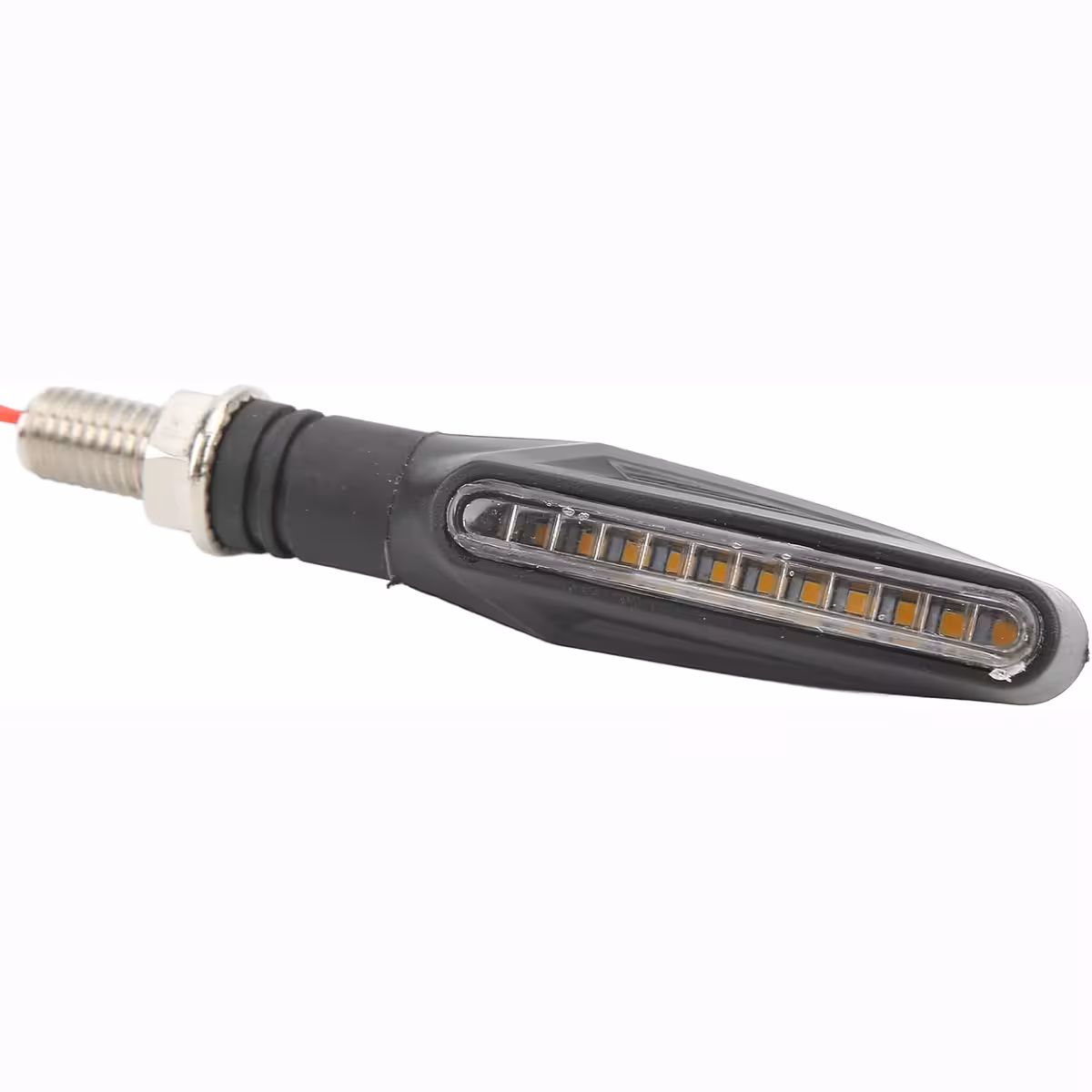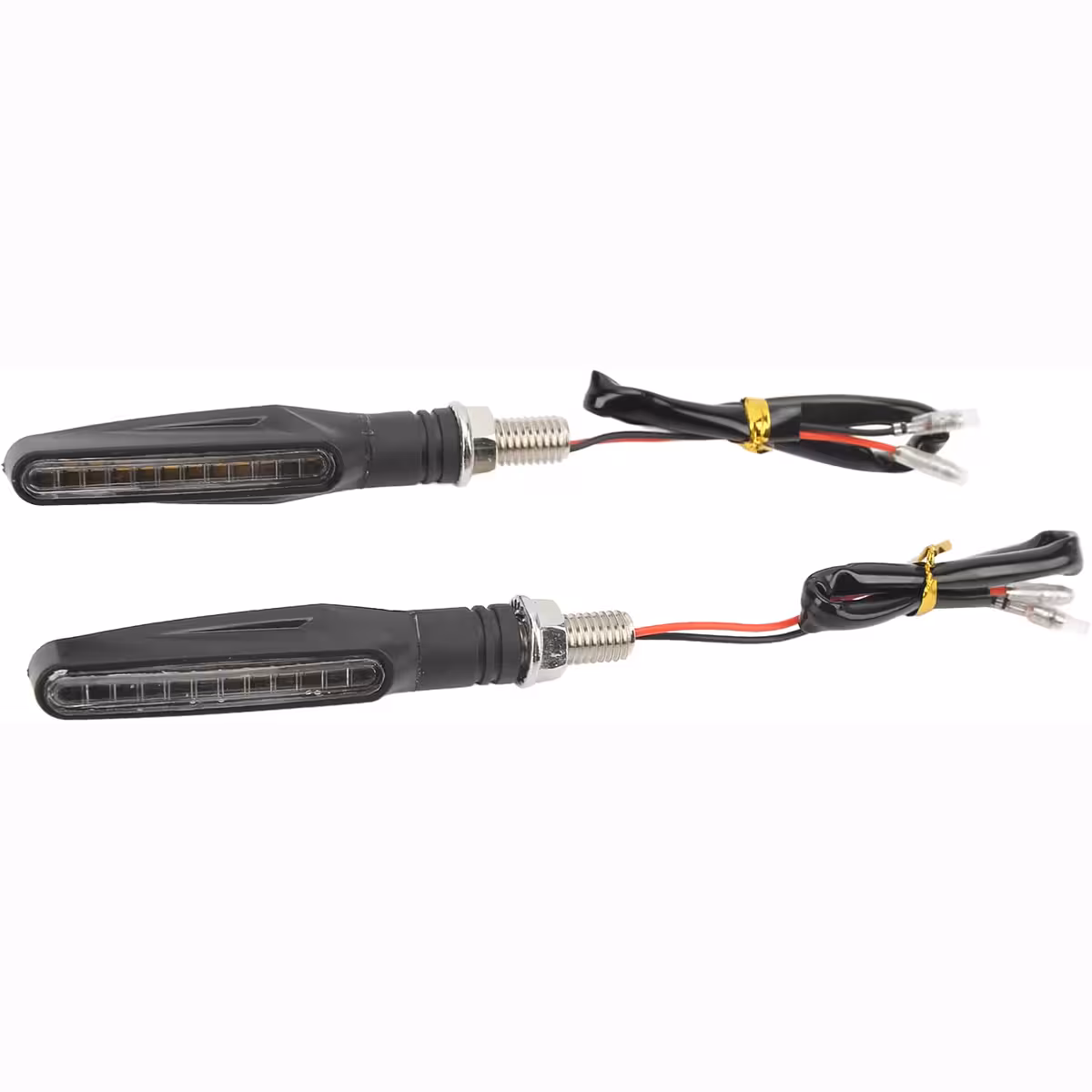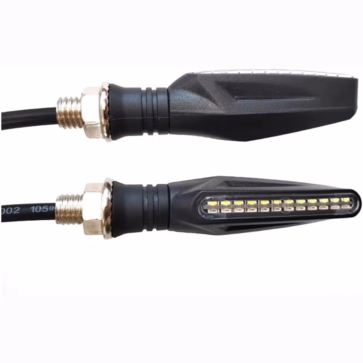Set universale di indicatori moto LED dinamici con effetto sequenziale, compatibili con moto, scooter e ATV. Il design moderno con bordi definiti e linee fluide conferisce un aspetto elegante, mentre la tecnologia LED garantisce basso consumo energetico e alta luminosità per massima visibilità.