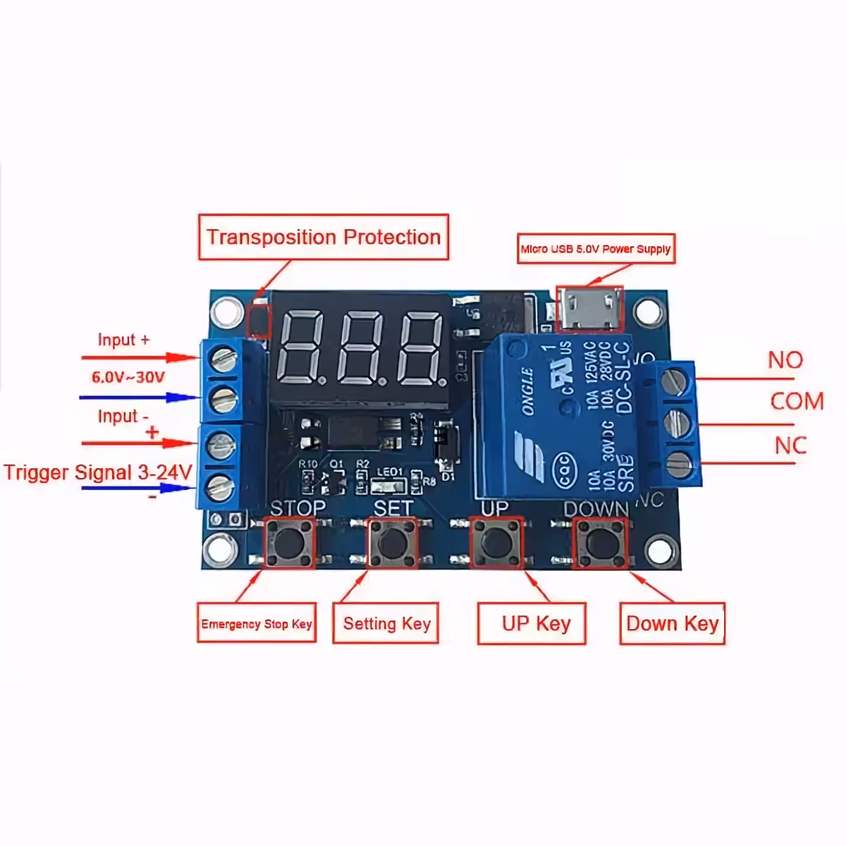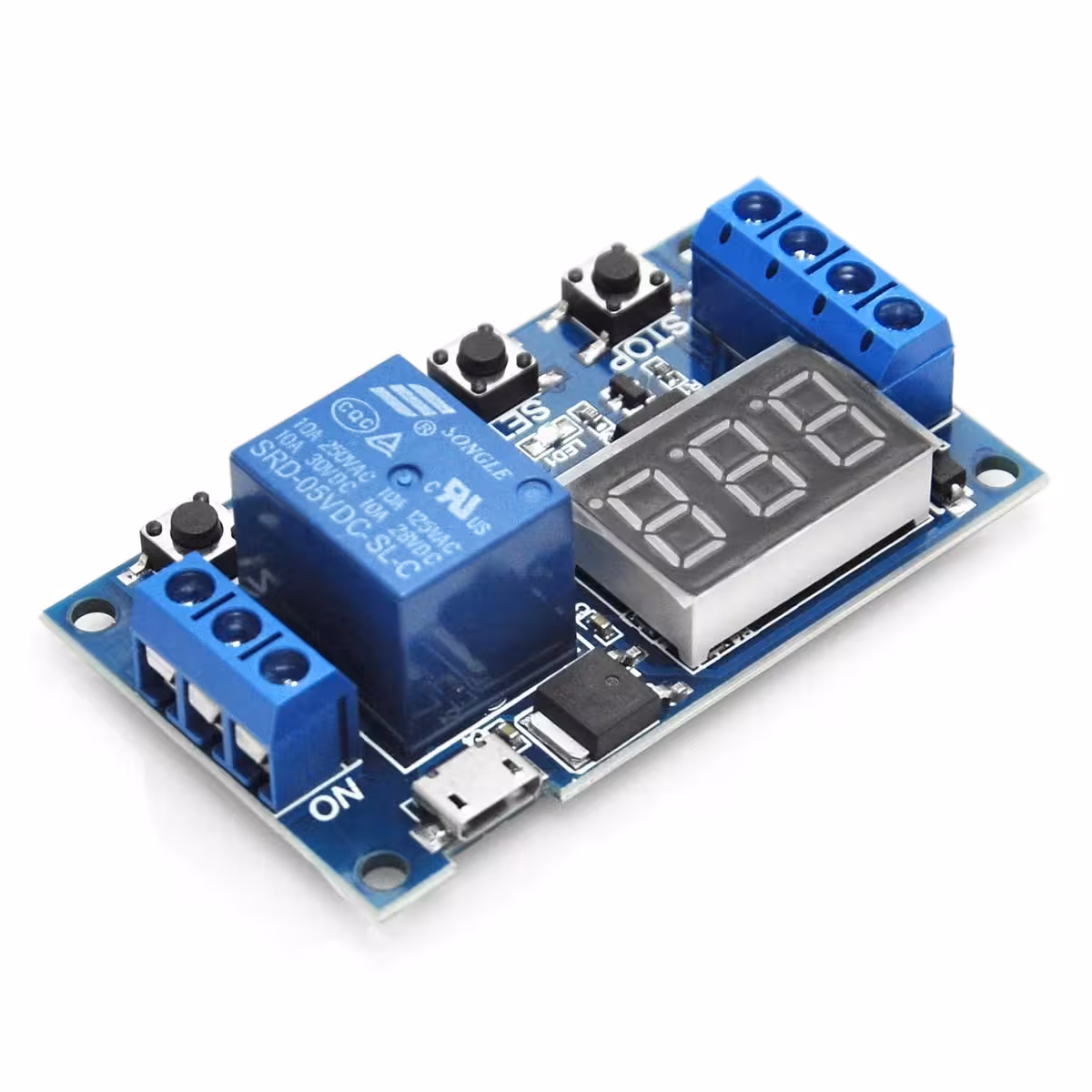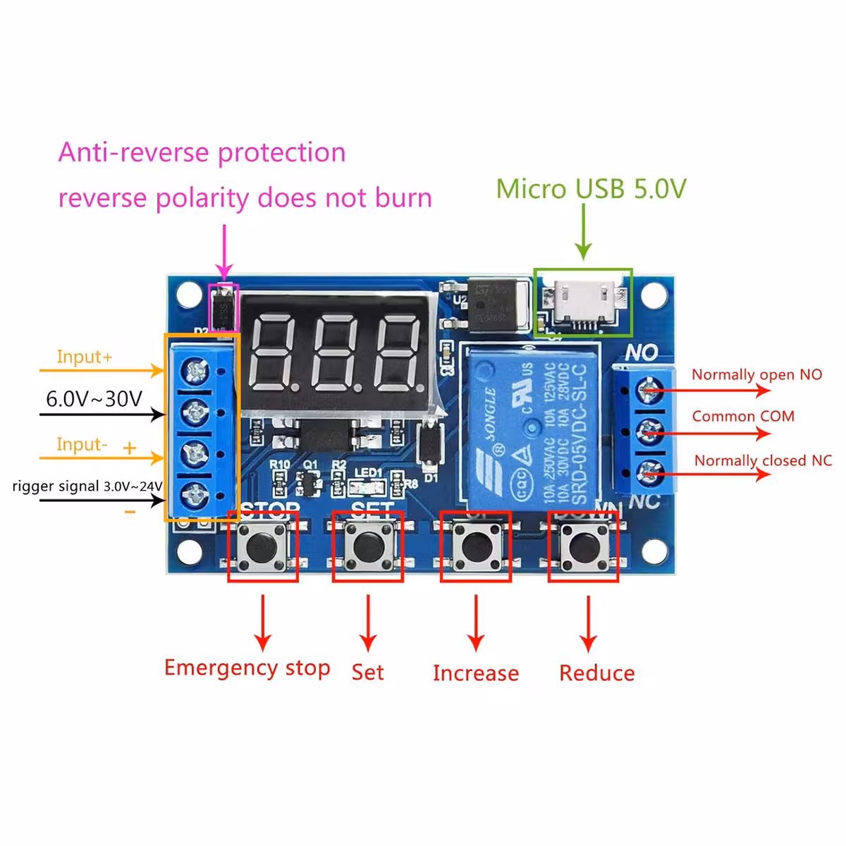 Modulo relè con ritardo e tempo regolabile, compatibile 6–30V (alimentazione MicroUSB 5V possibile). Ideale per applicazioni industriali e DIY che richiedono un modulo relè con ritardo, comando e tempo regolabile, con display digitale e anti-interferenze.