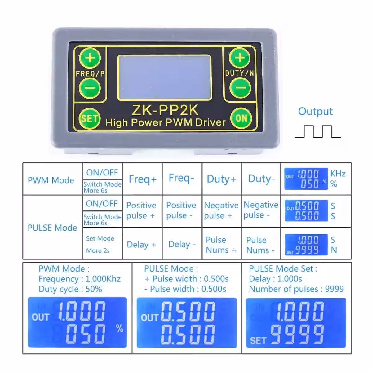 Frequenza predefinita di fabbrica: 1KHz, ciclo di lavoro 50%.
