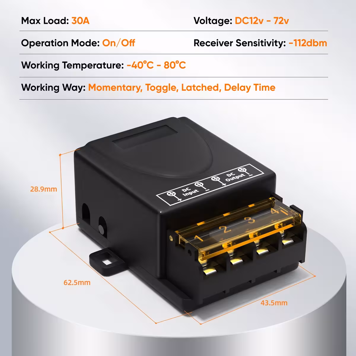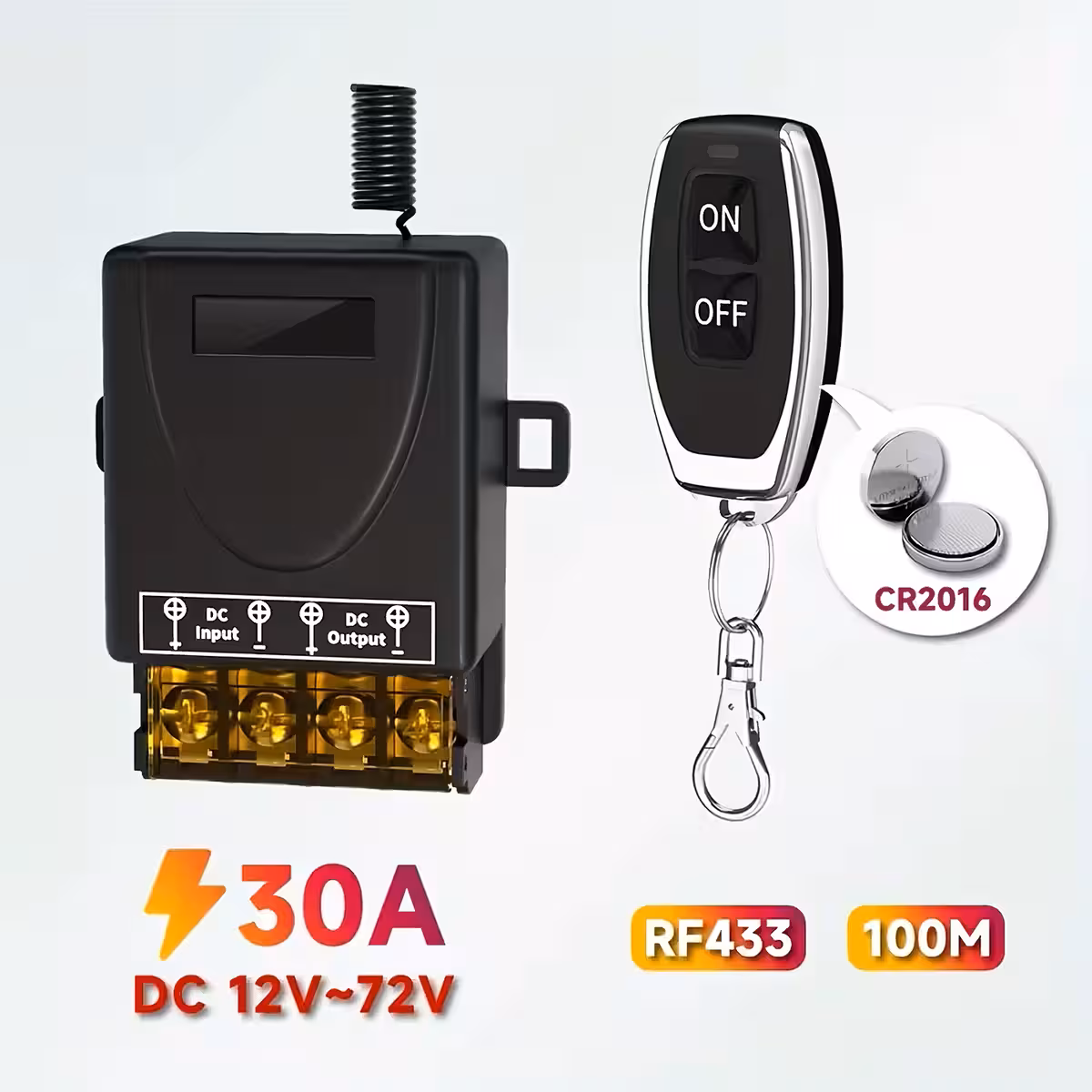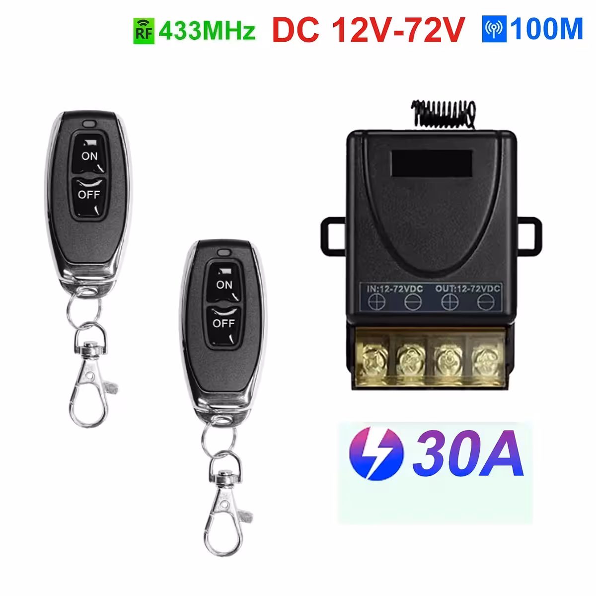Questo relè con telecomando 12V–60V 30A è un interruttore ad alta potenza, ideale per il controllo remoto di pompe, luci, macchinari, prese, sistemi auto o domestici e installazioni smart home. Funziona alla frequenza RF 433.92MHz ed è fornito con 2 telecomandi.