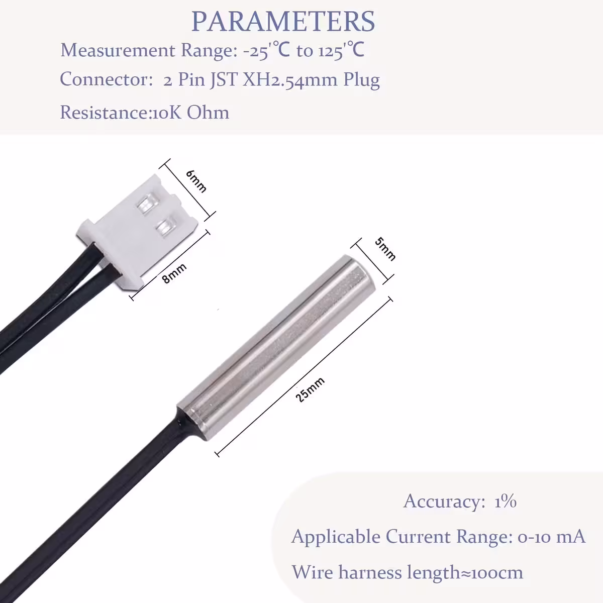 Sonda NTC 10K ±1% offre eccellente stabilità, tempo di risposta rapido e affidabilità a lungo termine.