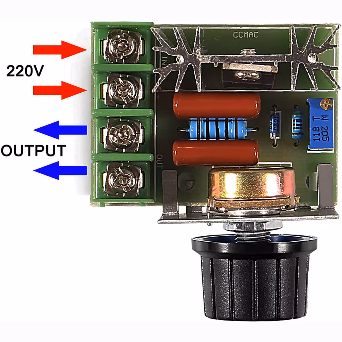 Il collegamento è semplice: i due fili di ingresso si collegano alla rete elettrica (fase e neutro), mentre i due fili di uscita si collegano al carico elettrico da controllare (motore, ventilatore, lampada, ecc.). Assicurati che l’apparecchiatura collegata non superi la potenza massima supportata di 2000W. Per carichi elevati si consiglia l’installazione di una ventola aggiuntiva per il raffreddamento del dissipatore.